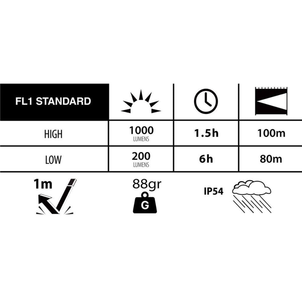 LastnostiSvetilnost: 100-1000 lumnov (min-max), Dolžina snopa: 100m, Avtonomija: 1,5-6 h (min-max), Teža: 215g.