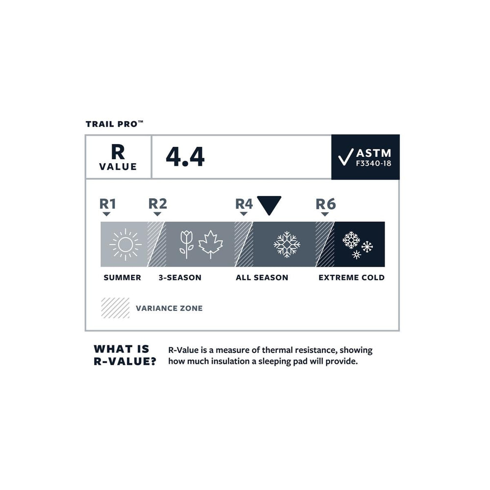 Spalna podloga Trail Pro bo poskrbela za udobje med vašimi pustolovščinami v naravi. Samonapihljiva pena meri 7,6 cm in ima konstrukcijo StrataCore, ki zagotavlja najboljše razmerje med toploto in težo med vsemi samonapihljivimi penami. Trail Pro ima R-vrednost 4,4, kar omogoča avanturistom, da uživajo v pohodništvu in kampiranju skozi vse leto. Vsestranska samonapihljiva blazina ima visokozmogljiv ventil WingLock, ki ima trikrat večji pretok zraka kot klasični ventil, zahvaljujoč večji odprtini in enosmernemu napihovanju. Blazina vključuje kompaktno vrečko za shranjevanje.