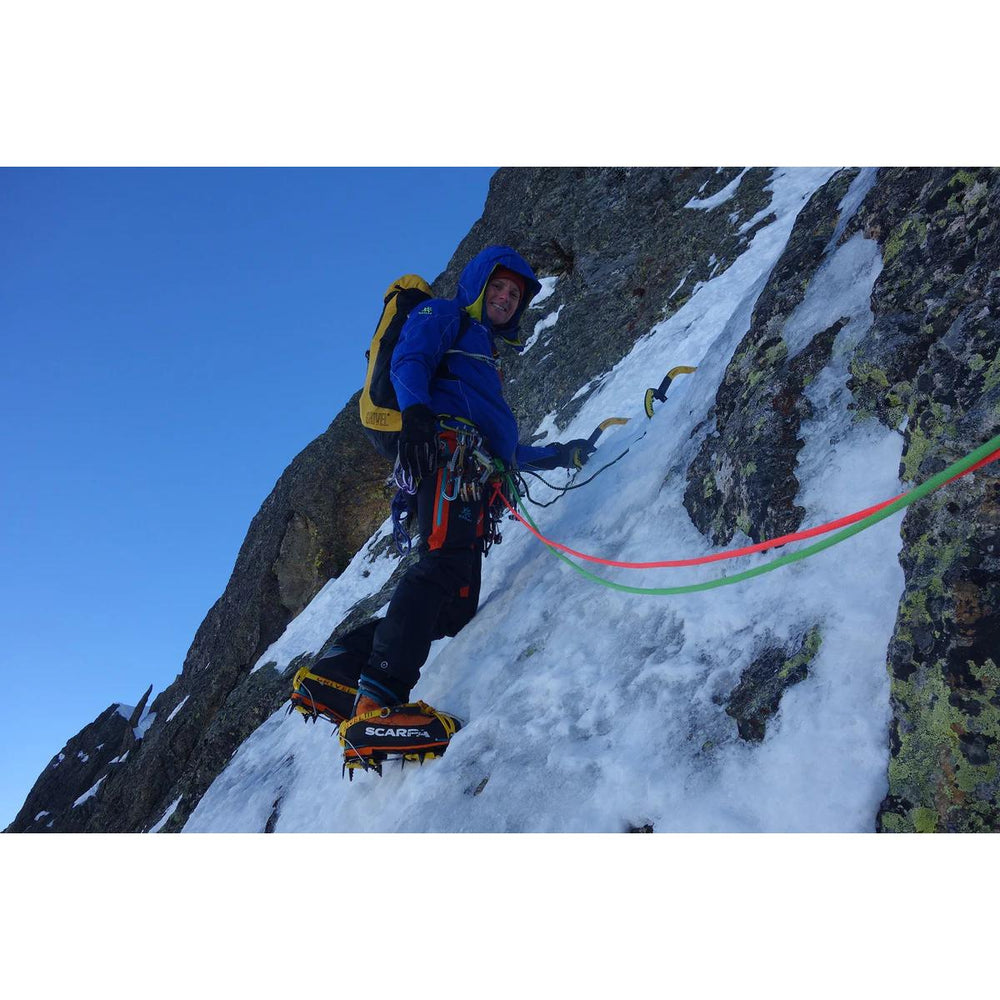 Polavtomatske dereze Grivel G12 New-Matic so zasnovane za alpinistične ture s plezalnimi elementi, pri čemer združujejo trpežno konstrukcijo iz krom-molibdenovega jekla z optimalno togostjo za strme vzpone. Sistem polavtomatskega zapenjanja omogoča hitro in enostavno pritrditev ob uporabi primerne obutve, konstrukcija z 12 zobmi, vključno z dvema vodoravno postavljenima sprednjima zoboma, pa zagotavlja odličen oprijem na snegu in ledu ter stabilnost na zahtevnih terenih. Snežne blazinice (antibottes) učinkovito preprečujejo nabiranje snega pod krpljami, asimetrična zasnova in prilagodljivost za čevlje velikosti 36–47 pa poskrbita za dobro prileganje, zaradi česar so te dereze odlična izbira za večino plezalcev.